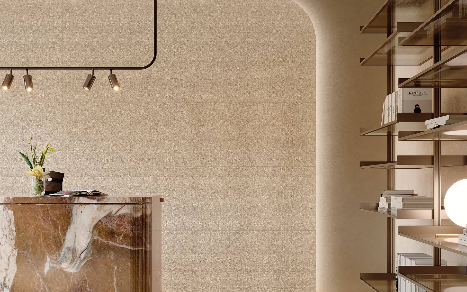 Eine Gesteinsart englischen Ursprungs mit edlem Charakter erwacht in einem Projekt zu neuem Leben, das dank der Fusion von ästhetischer Forschung und Technologie ihre Qualitäten mit einem originellen zeitgenössischen Akzent aufwertet.