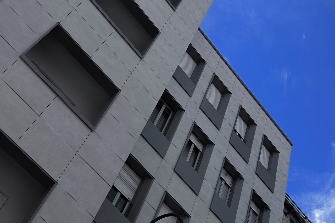 Das Architekturbüro Box Architetti hat zusammen mit den Planern von Granitech die optimale Lösung in Form von hinterlüfteten Wänden gefunden, die mit Feinsteinzeug verkleidet sind und von einer "hybriden" Struktur getragen werden, die in der Lage ist, die Platten zu stützen und das Risiko des Kippens der vorhandenen Ausfachung zu verhindern. Dank des Systems GHP Granitech, das ein einziges vertikales Element mit Befestigung der Keramikmodule mit strukturellem Silikon und versteckten Sicherheitsklammern vorsieht, sind die Wände nur 19 cm dick, einschließlich einer 10 cm dicken Polyurethan-Isoliermatte.