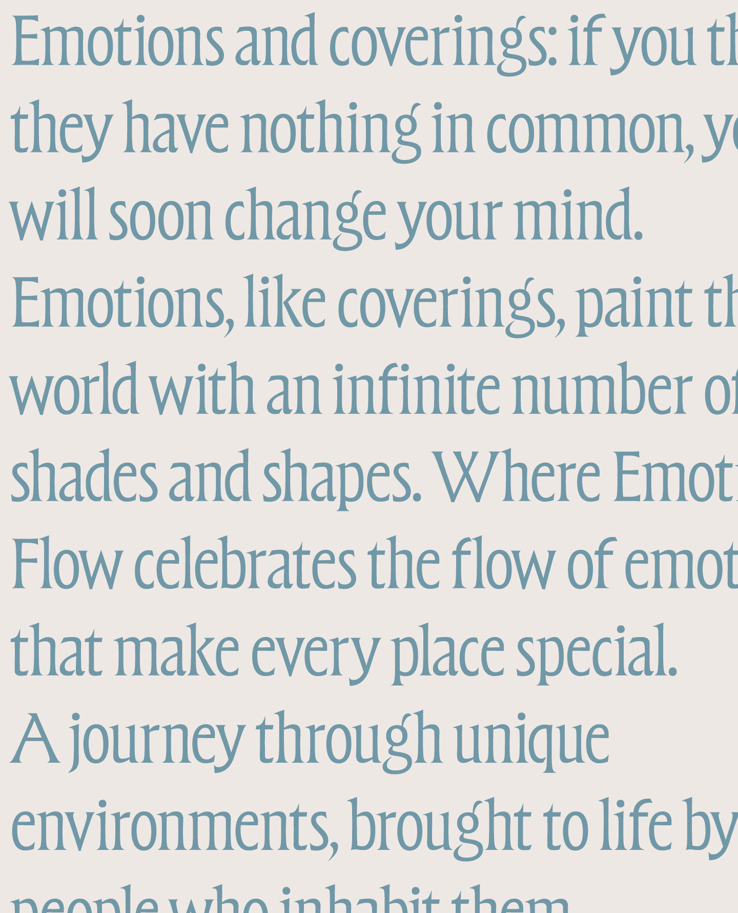 Emotionen und Oberflächen. Wer denkt, dass sie nichts gemeinsam haben, wird schnell eines Besseren belehrt. Emotionen überziehen die Welt wie Beschichtungen mit unzähligen Schattierungen und Formen. Where Emotions Flow feiert den Fluss der Emotionen, die jeden Ort zu etwas Besonderem machen. Es ist eine Reise durch einzigartige Umgebungen, die zusammen mit den Menschen, die sie erleben, zum Leben erweckt werden.